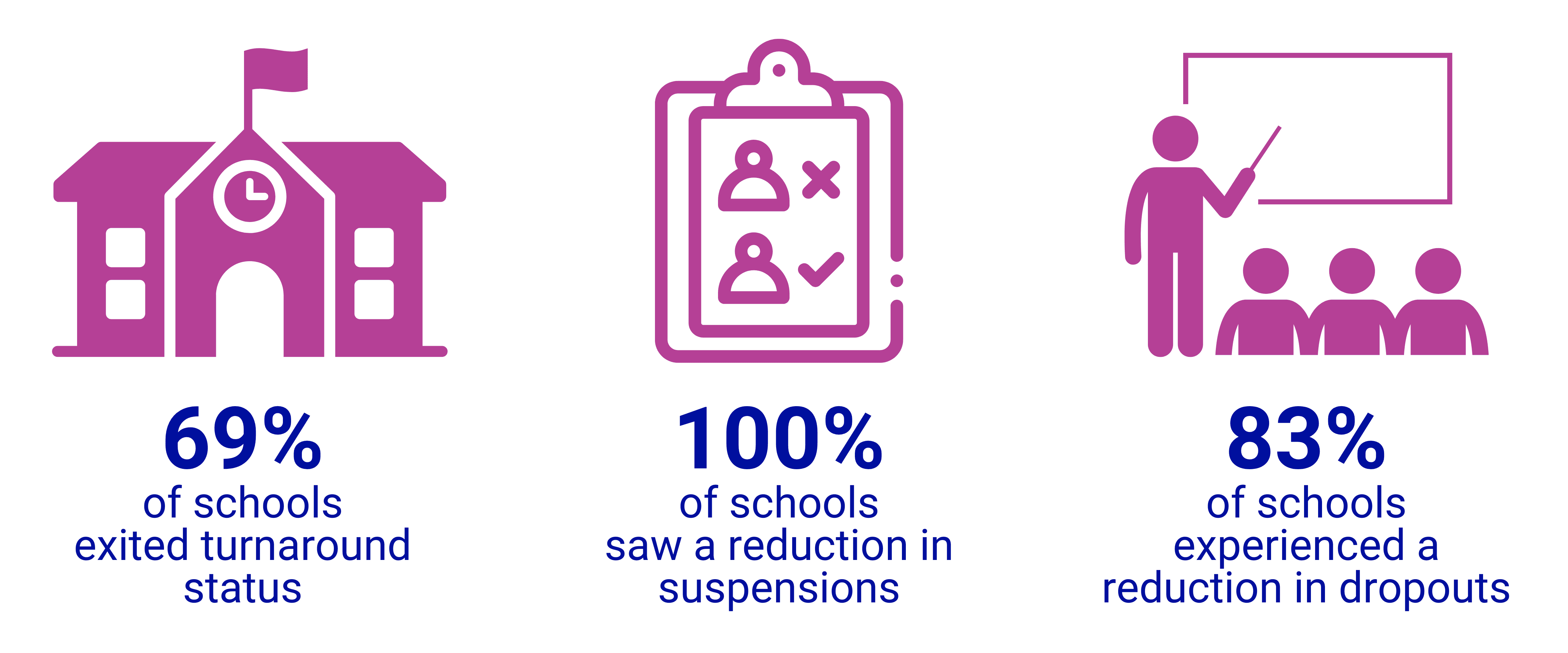 Within the first two years of our partnership, 69% (11/16) of schools with the CSI status achieved school improvement gains that allowed them to exit turnaround status. 60% also increased their 5-year graduation rates and 83% of schools experienced a reduction in school dropouts. Additionally, 100% saw a reduction in both In-School & Out-of-School Suspensions. During the second year we were engaged with Dillard Middle School, they ranked as one of the top 11 schools that exceeded growth expectations. This was the first time in their history that they achieved this level of growth. In addition, Bessemer Elementary was ranked as 9th/126 schools that demonstrated growth in 2020/2021, with an overall growth index of 4.33% within the first two years of working with us. The project has been successful on many accounts, but the work is not done.